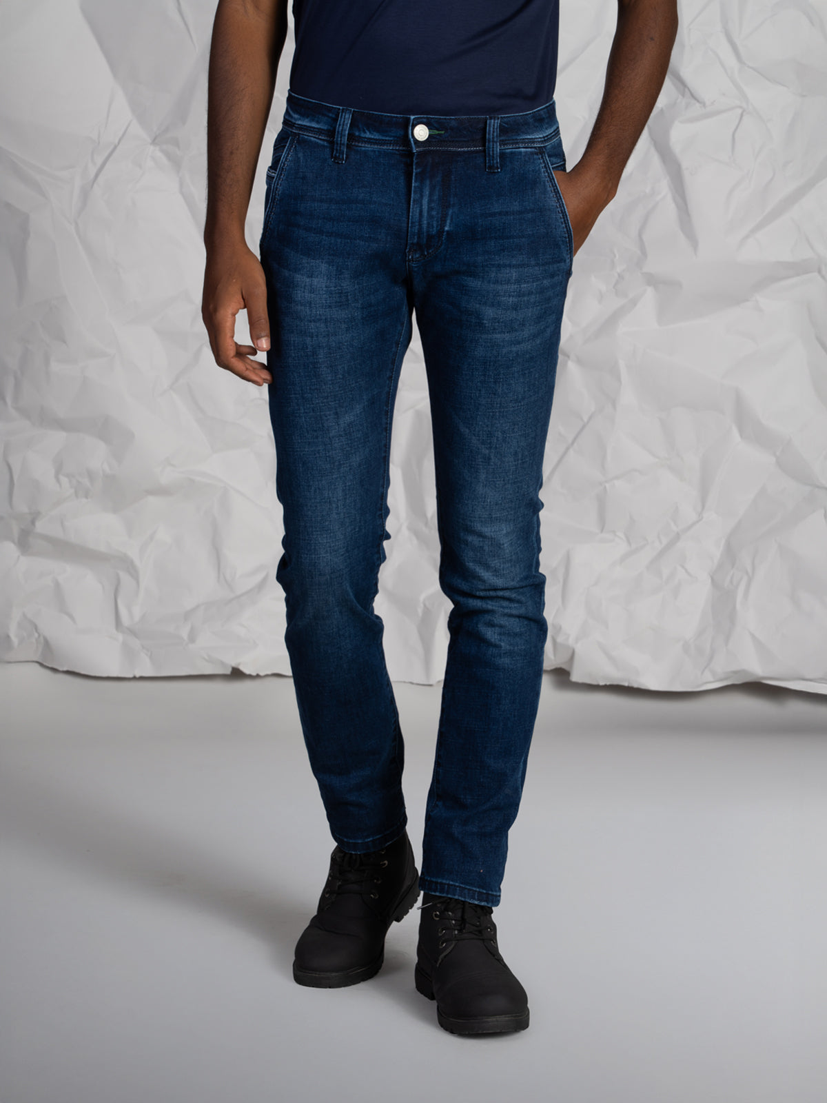 Jeans uomo RIARDO in denim scuro elasticizzato. Vestibilità slim fit per un look moderno e confortevole, perfetto in ogni occasione.