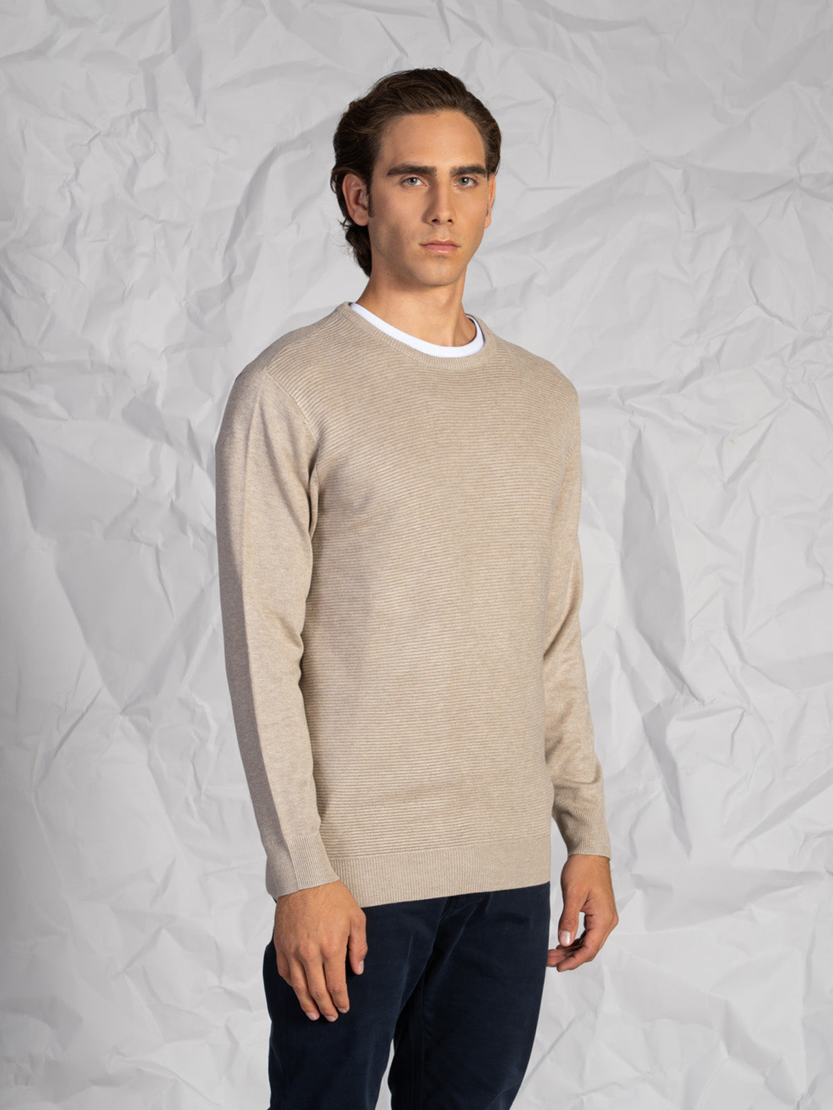 Maglia da uomo girocollo a manica lunga, realizzata in tessuto misto morbido e confortevole, ideale per la stagione più fresca. Il design combina lavorazione liscia su retro e maniche con una trama rigata sul davanti, creando un effetto moderno e raffinato.