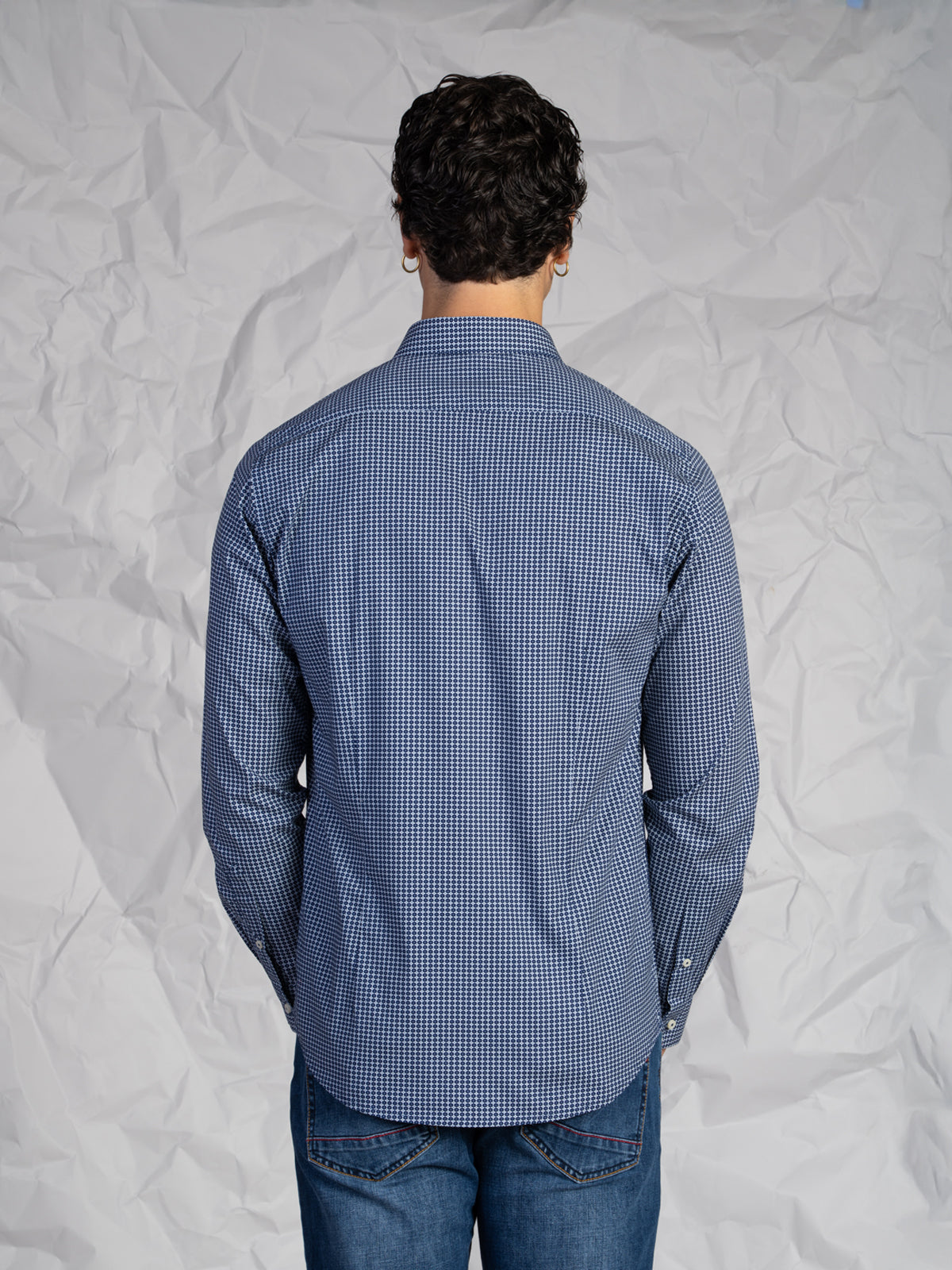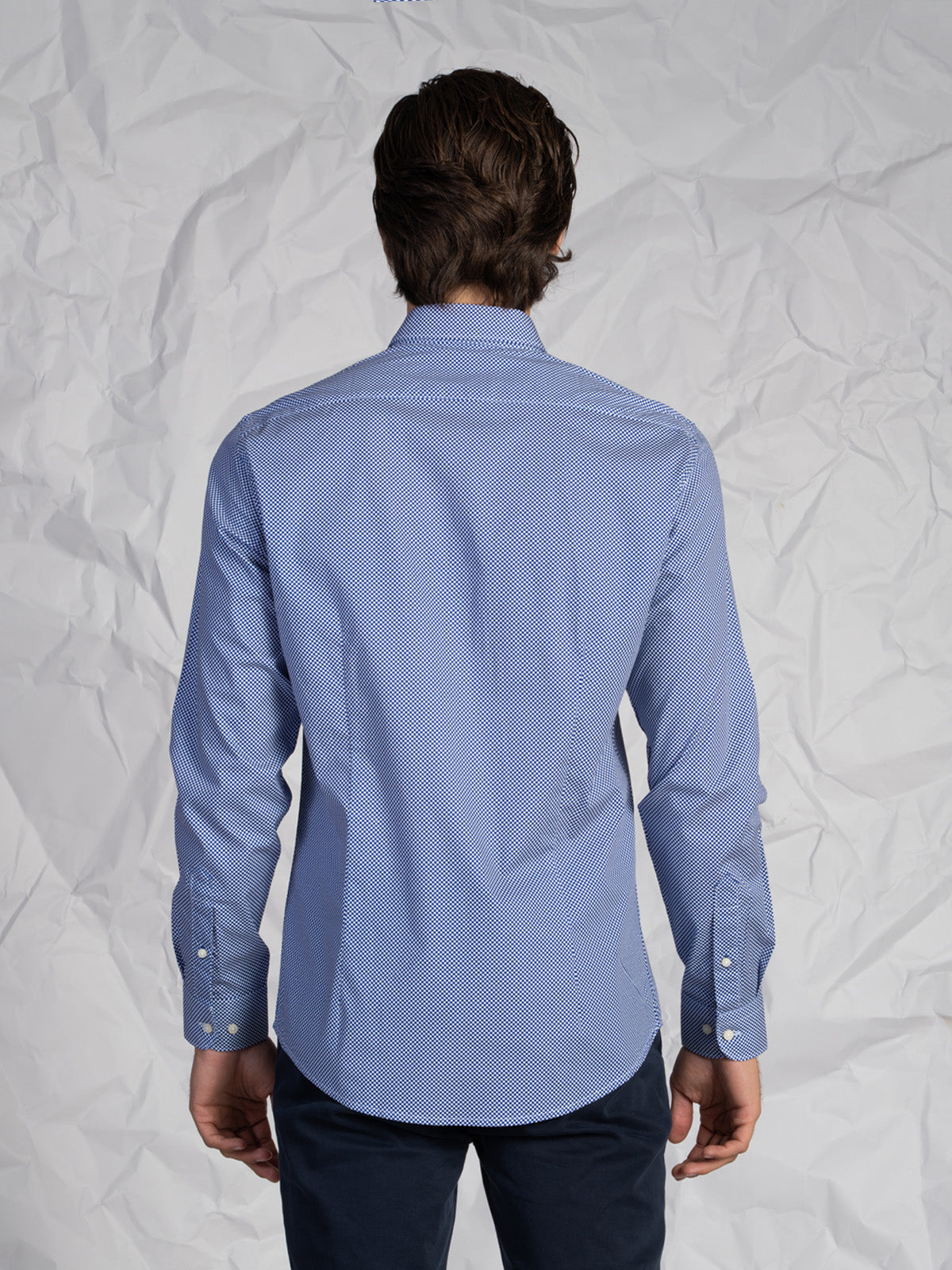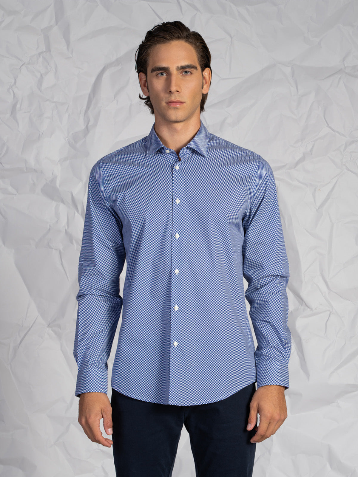 Camicia da uomo fantasia a quadretti blu, realizzata in cotone elasticizzato per offrire comfort, traspirabilità e libertà di movimento. Il collo classico e i polsini smussati conferiscono un tocco di eleganza discreta, mentre i rinforzi laterali garantiscono maggiore durata e una vestibilità sempre perfetta.
