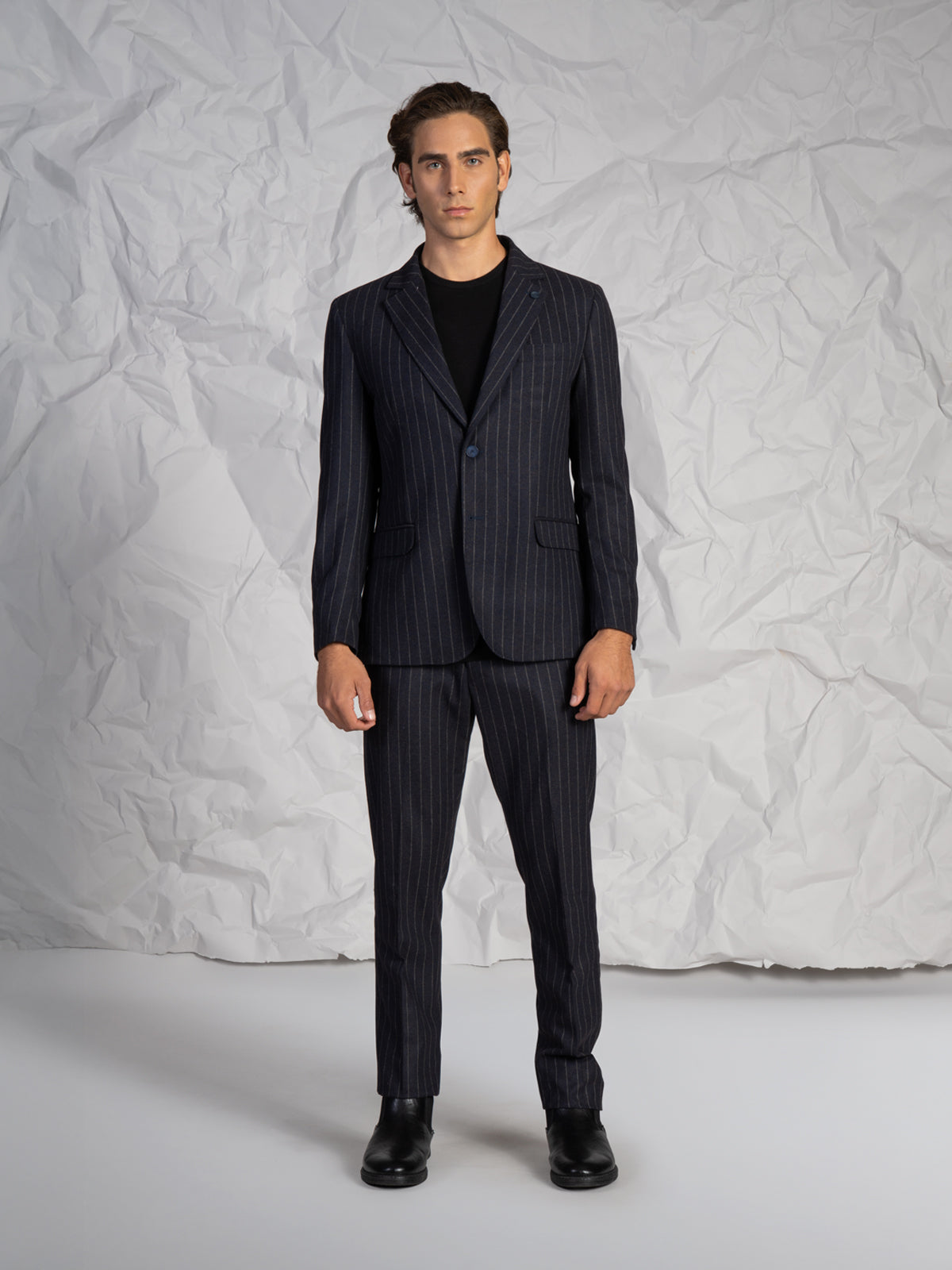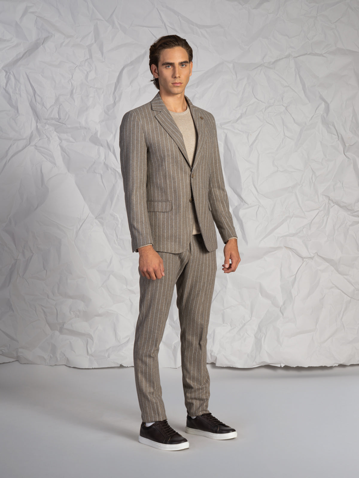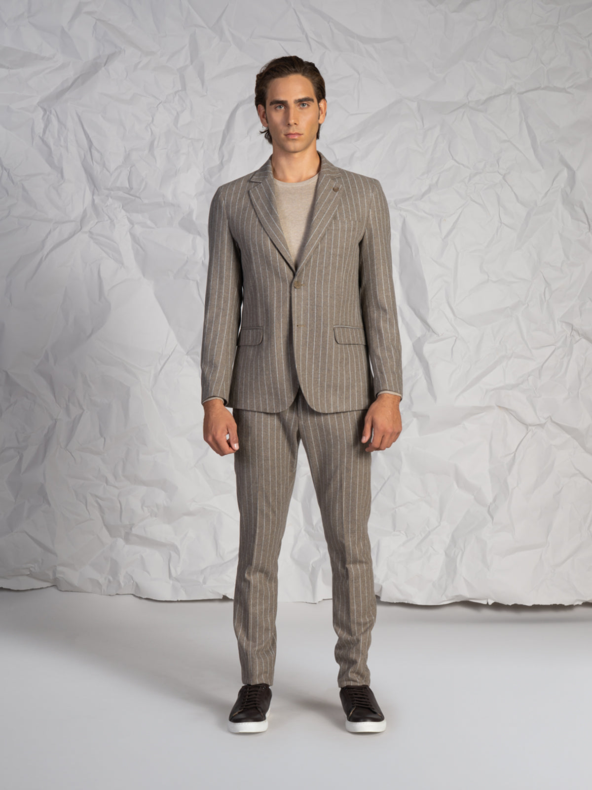 Abito da uomo con fantasia a righe, dal design elegante e moderno. Ideale per occasioni formali, cerimonie o contesti business, è un capo versatile pensato per chi cerca uno stile curato e senza tempo.