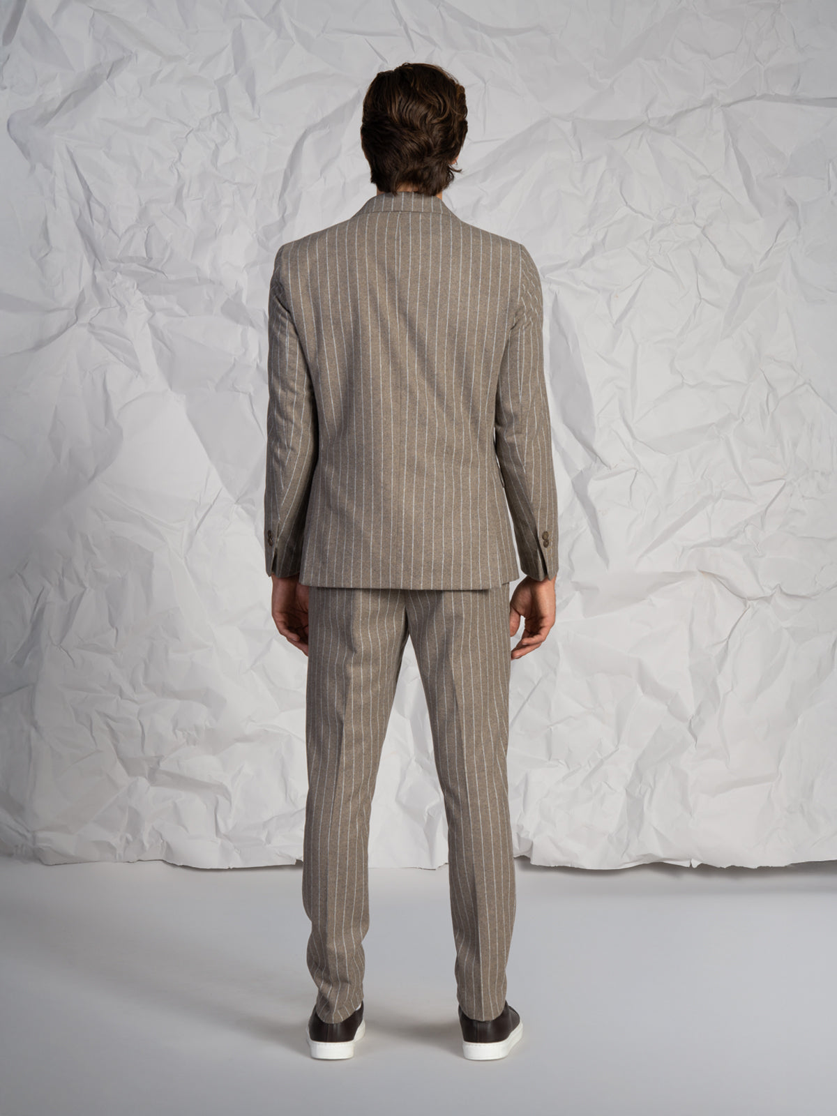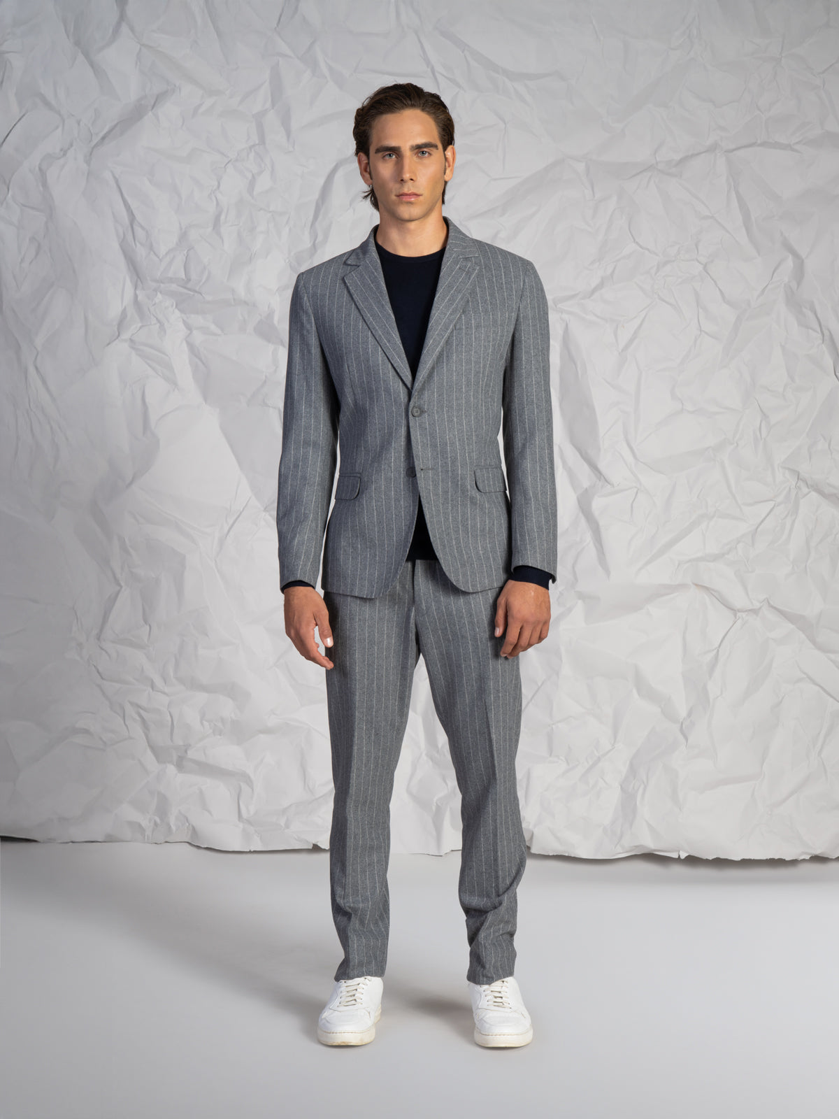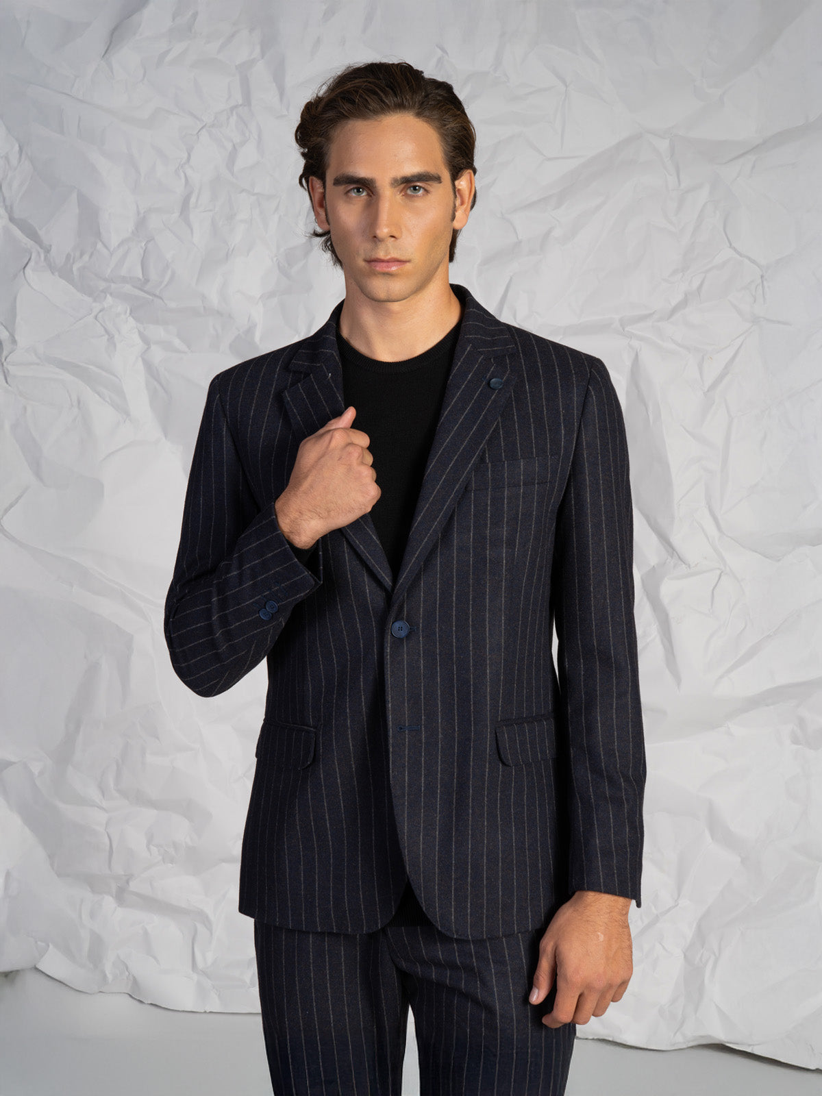 Abito da uomo con fantasia a righe, dal design elegante e moderno. Ideale per occasioni formali, cerimonie o contesti business, è un capo versatile pensato per chi cerca uno stile curato e senza tempo.