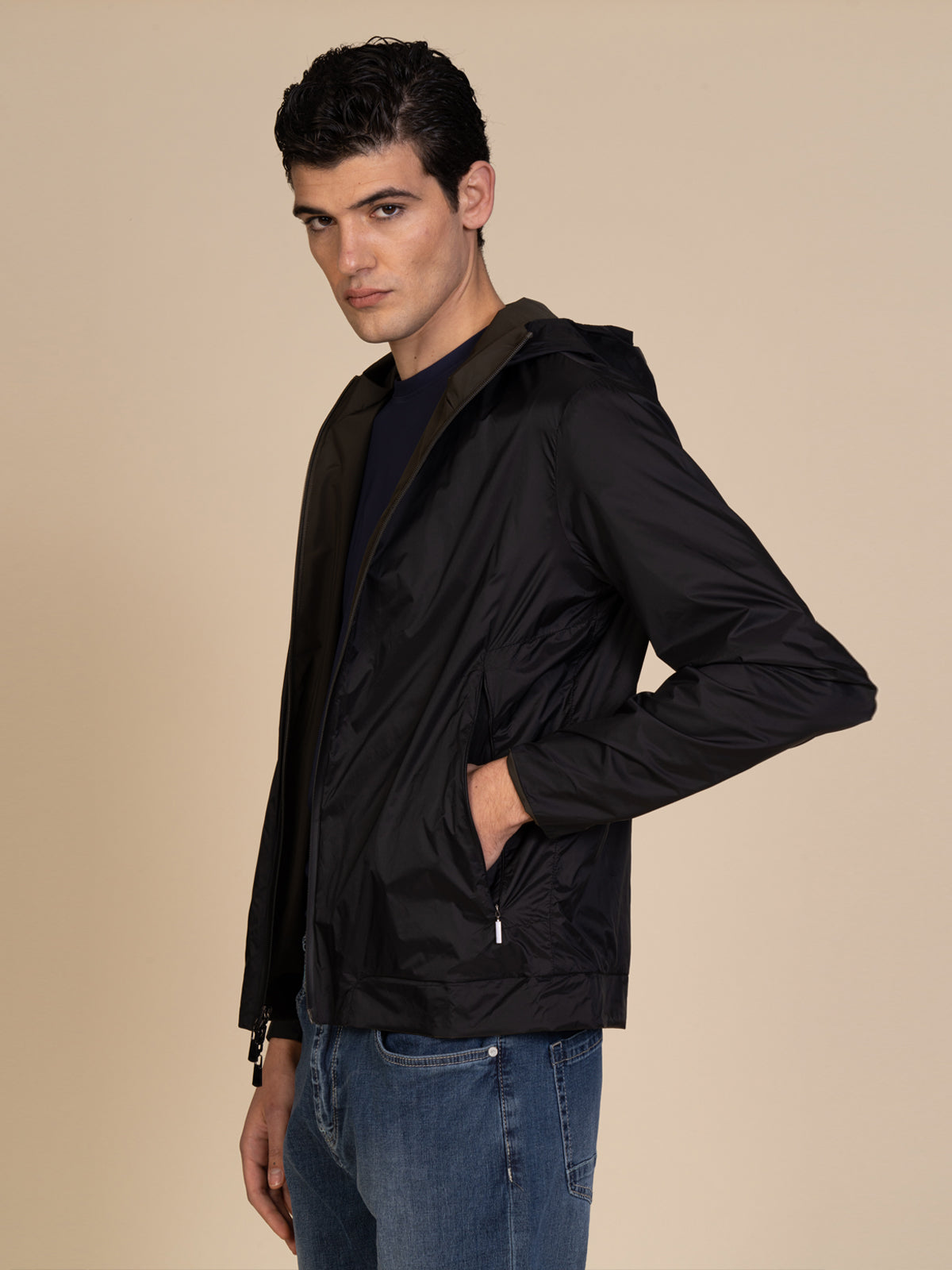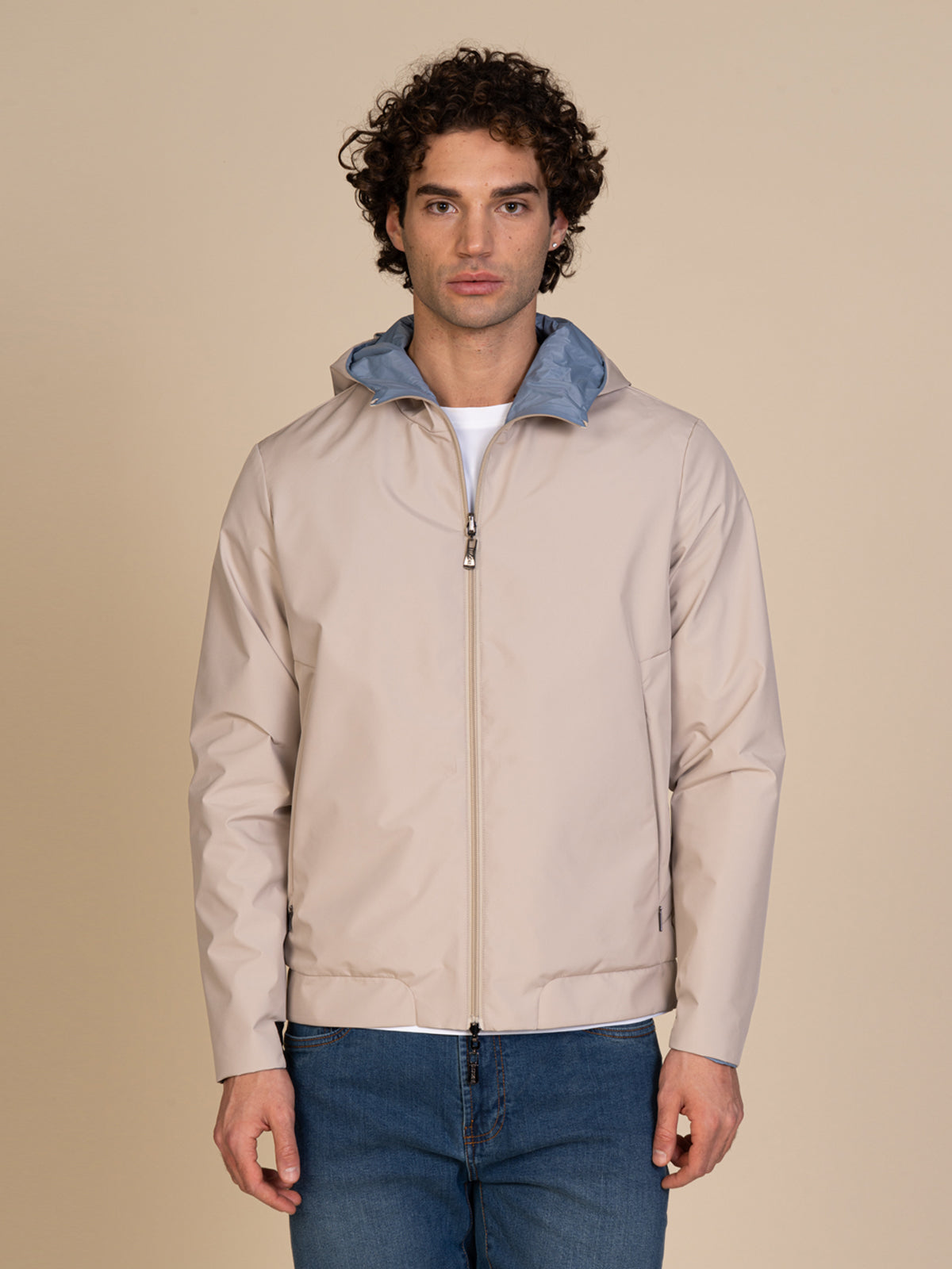 Giubbotto da uomo reversibile (double face), pensato per offrire massima versatilità in un unico capo. Grazie alla doppia indossabilità, permette di creare look diversi con semplicità, adattandosi a ogni occasione. Il modello è dotato di cappuccio e chiusura frontale con zip, dettagli pratici che garantiscono comfort e protezione. Le due tasche a filo con zip assicurano funzionalità e sicurezza, mantenendo una linea pulita e moderna. Perfetto per outfit casual e dinamici firmati Blooker.