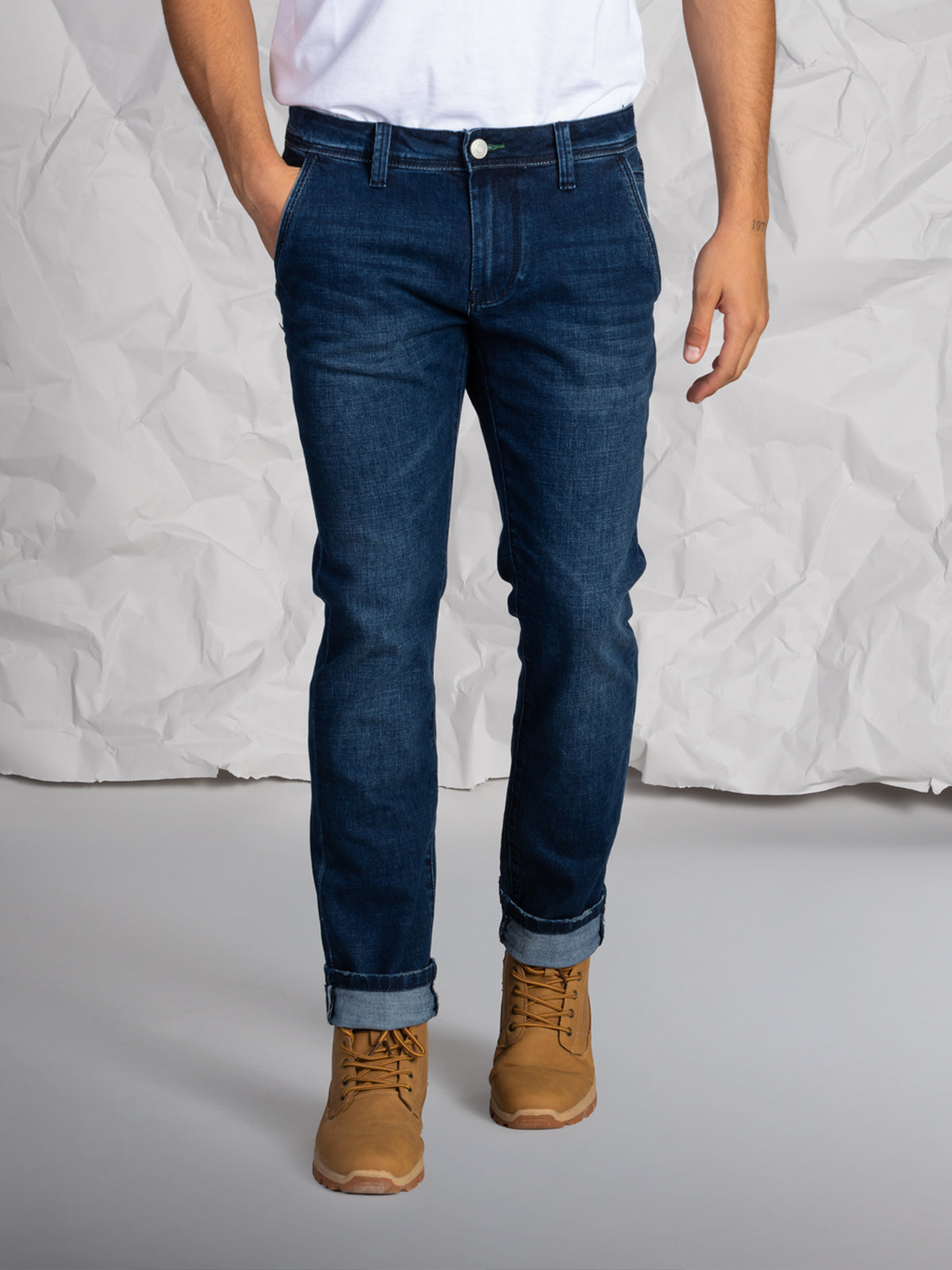 Jeans uomo RIARDO in denim scuro elasticizzato. Vestibilità slim fit per un look moderno e confortevole, perfetto in ogni occasione.