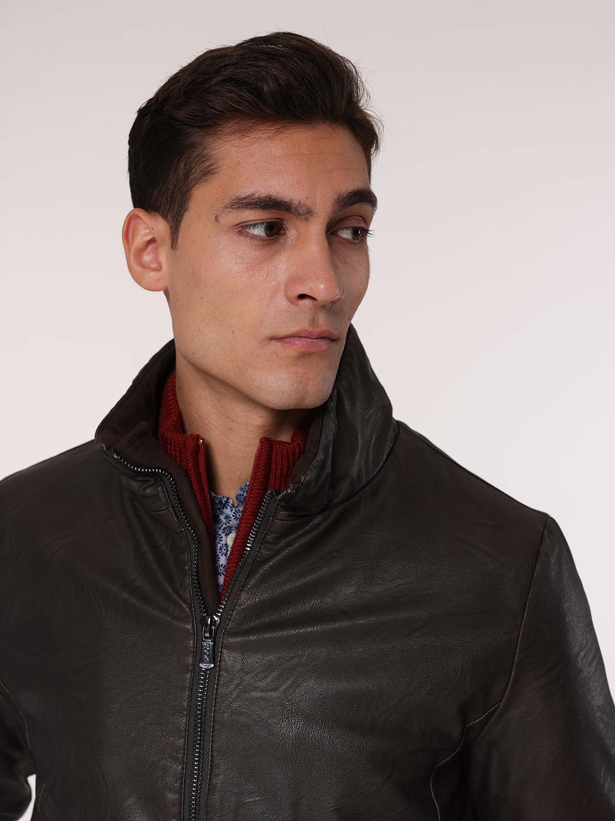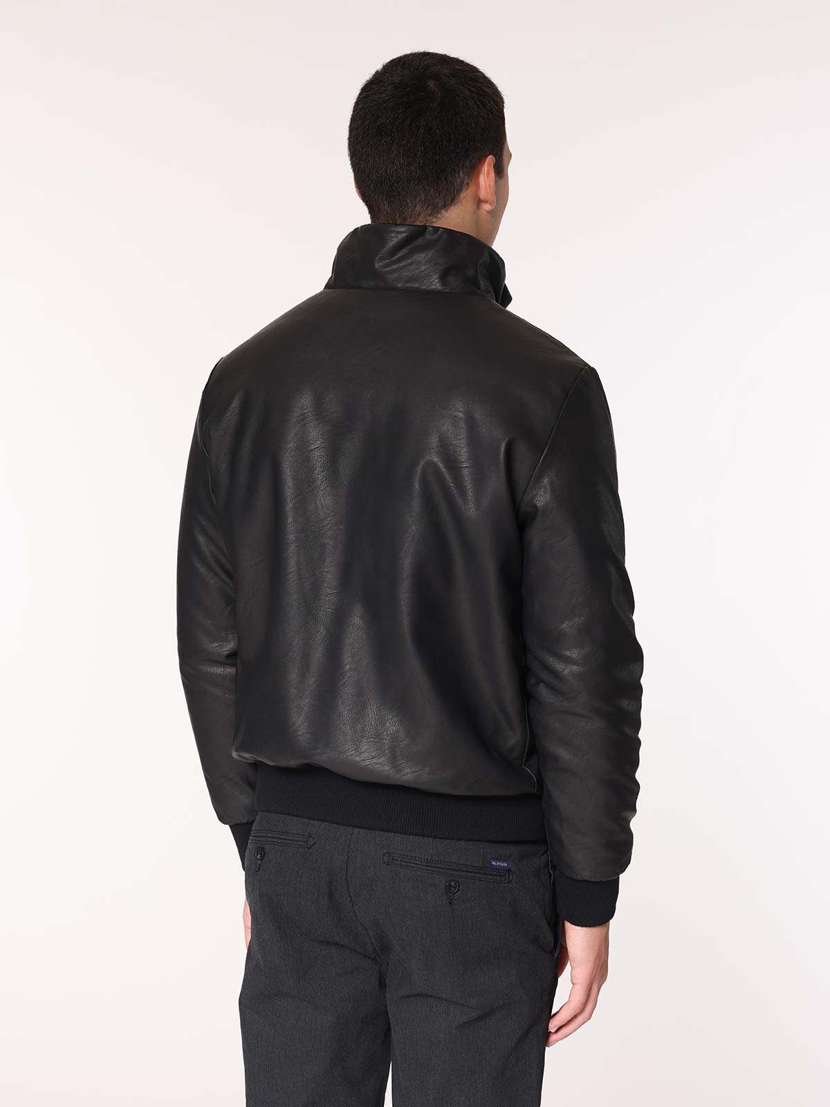 Giubbotto modello bomber in pelle sintetica. Chiusura con zip. Due tasche laterali a filo con zip. Bordi in maglia a coste.