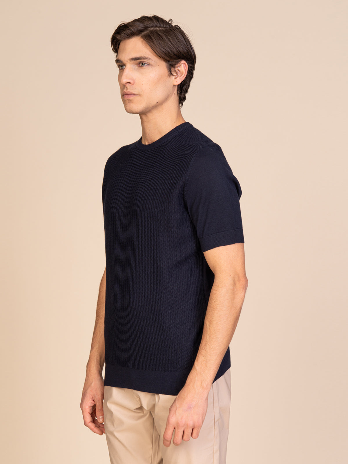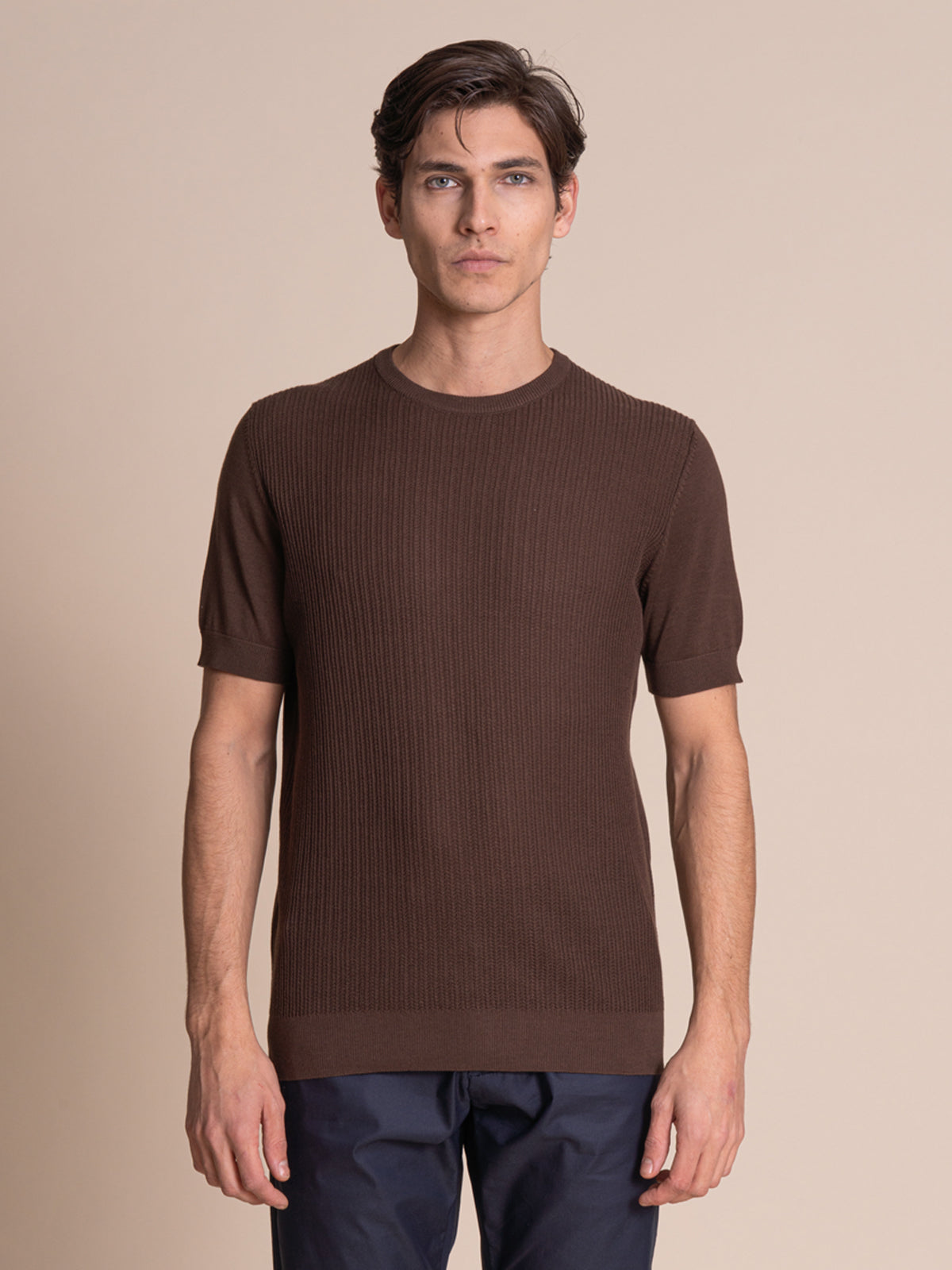 Maglia da uomo mezza manica girocollo realizzata in 100% cotone, perfetta per un look curato ma informale. Il design si distingue per la lavorazione a maglia sul davanti, che dona texture e carattere al capo, mentre retro e maniche in lavorazione liscia garantiscono equilibrio e pulizia nelle linee. I bordi a coste assicurano una vestibilità confortevole e una finitura rifinita nei dettagli. Ideale da abbinare a jeans o pantaloni chino per outfit casual contemporanei firmati Blooker.