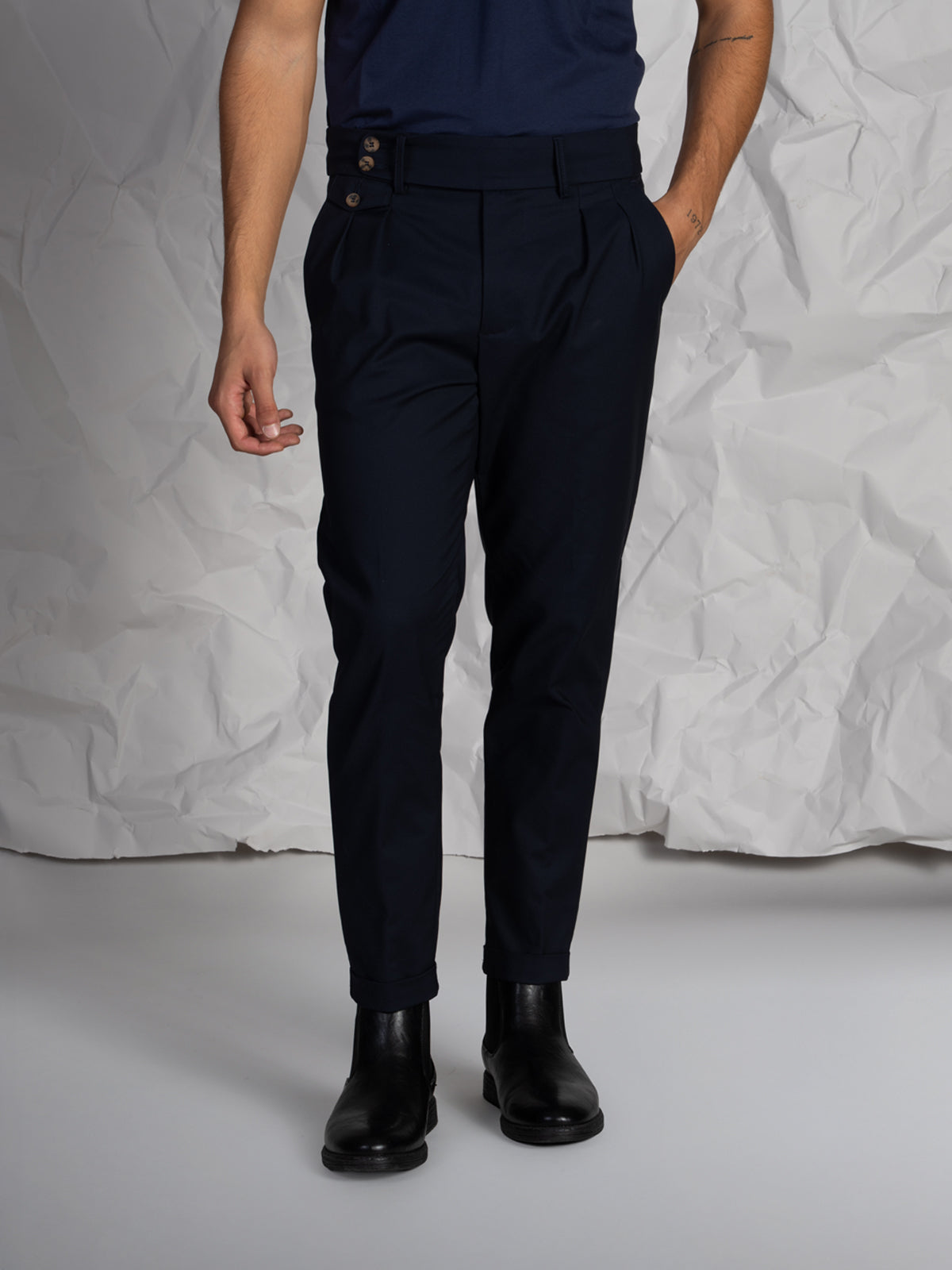 Le tasche a filo sul retro e il fintone in vita con doppio bottone completano un design elegante e versatile, perfetto per outfit casual-chic o look più formali. La vestibilità slim fit segue la linea della gamba senza costrizioni, mantenendo un aspetto moderno e raffinato, come nello stile inconfondibile Blooker.