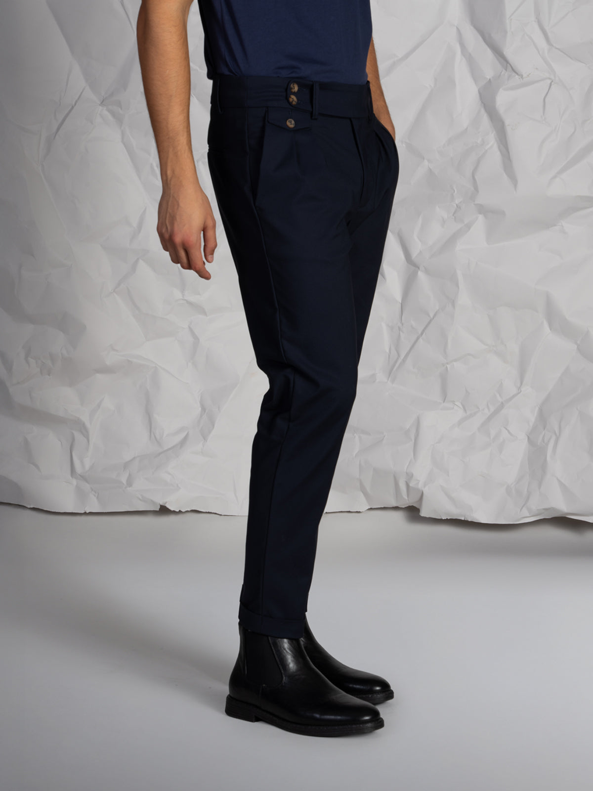 Pantaloni chino da uomo realizzati in cotone stretch, ideali per chi cerca comfort, libertà di movimento e uno stile curato. Il modello presenta tasche America sul davanti, una pence singola e un taschino con bottoncino, che aggiunge un tocco sartoriale.