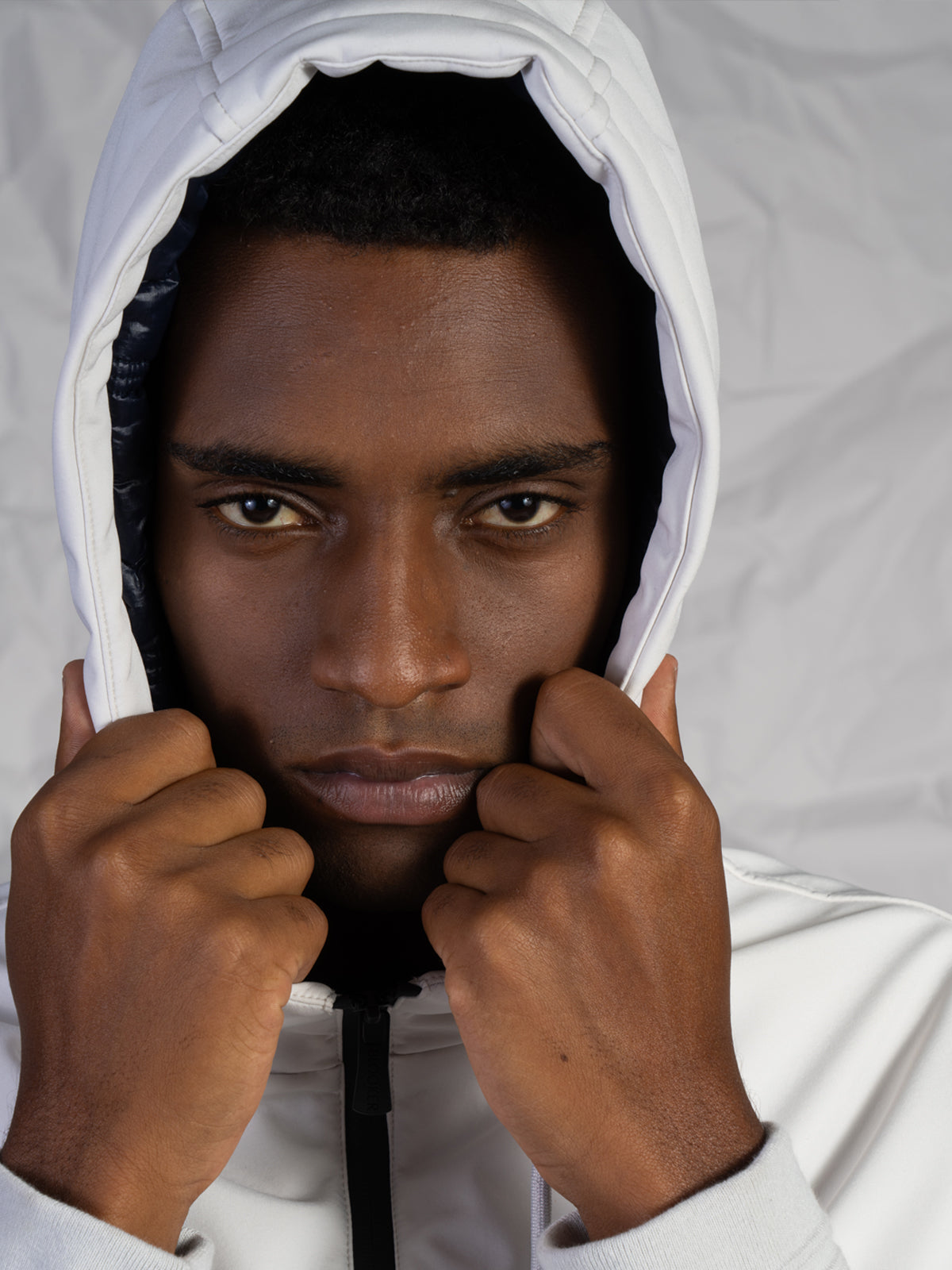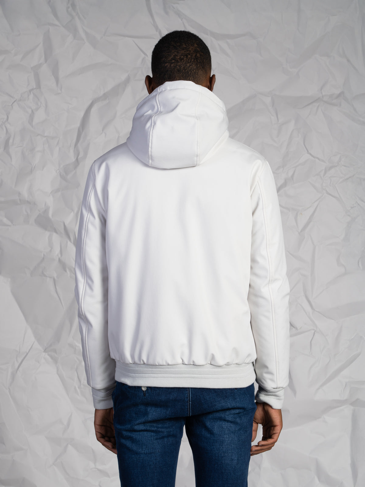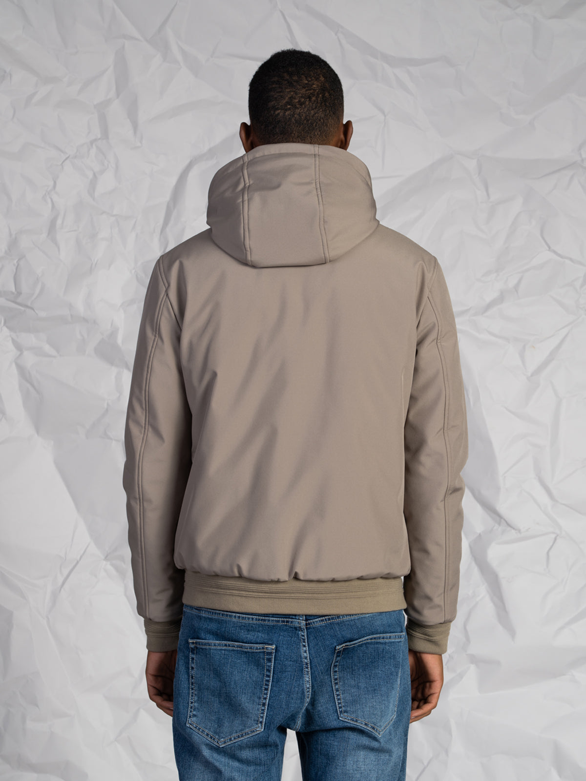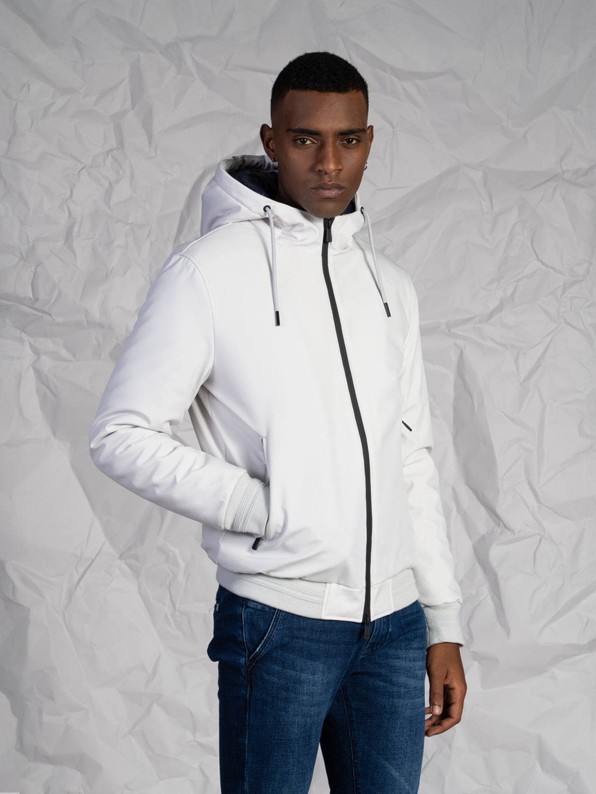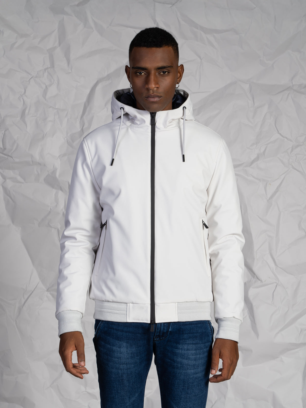 La chiusura frontale con zip rinforzata assicura una protezione ottimale, mentre le due tasche a filo con chiusura a zip offrono praticità e sicurezza. I polsini e il fondo in rib donano al capo una vestibilità aderente e un look sportivo e contemporaneo, perfetto per completare outfit casual o urban.Modello corto con imbottitura interna