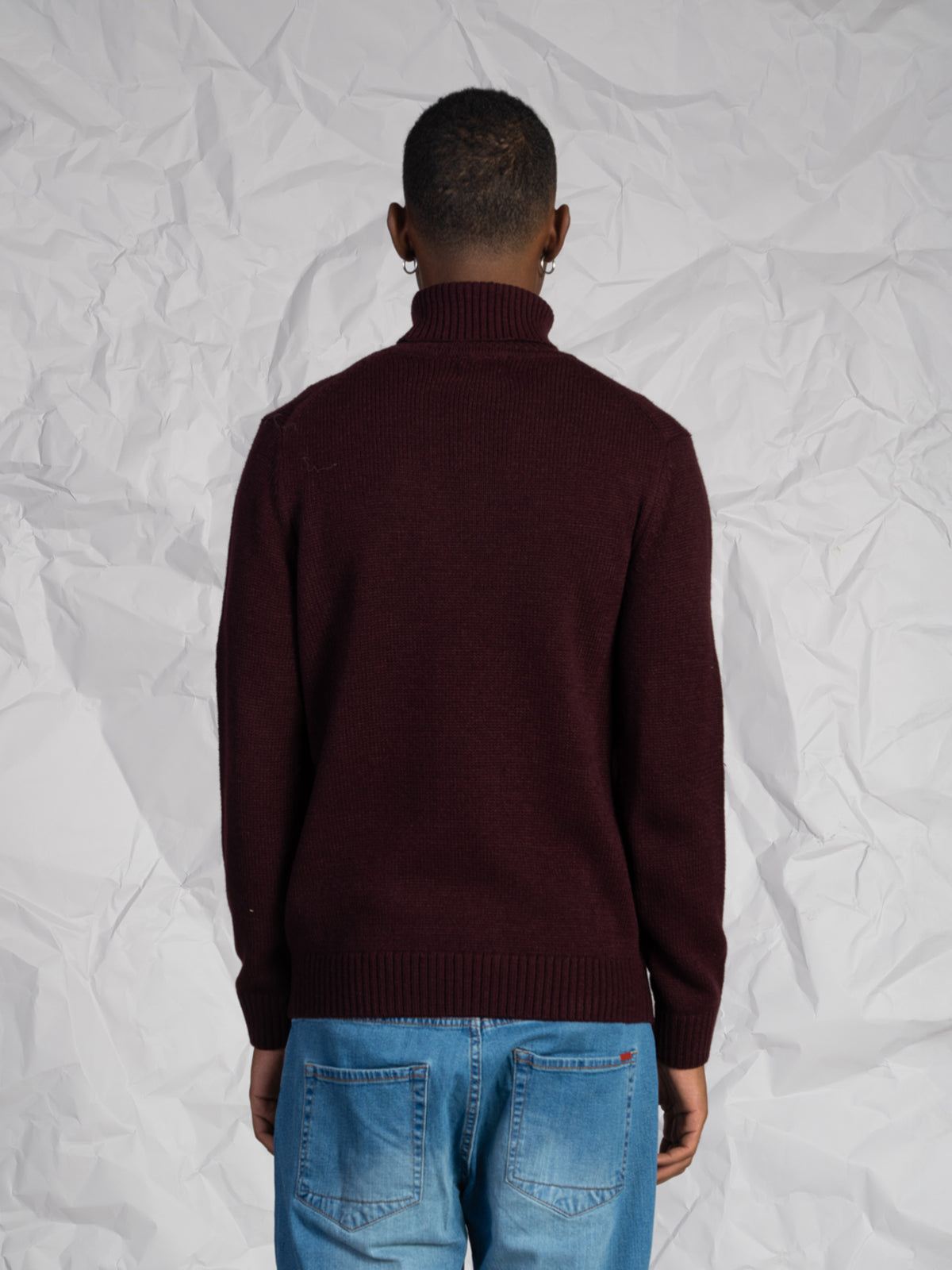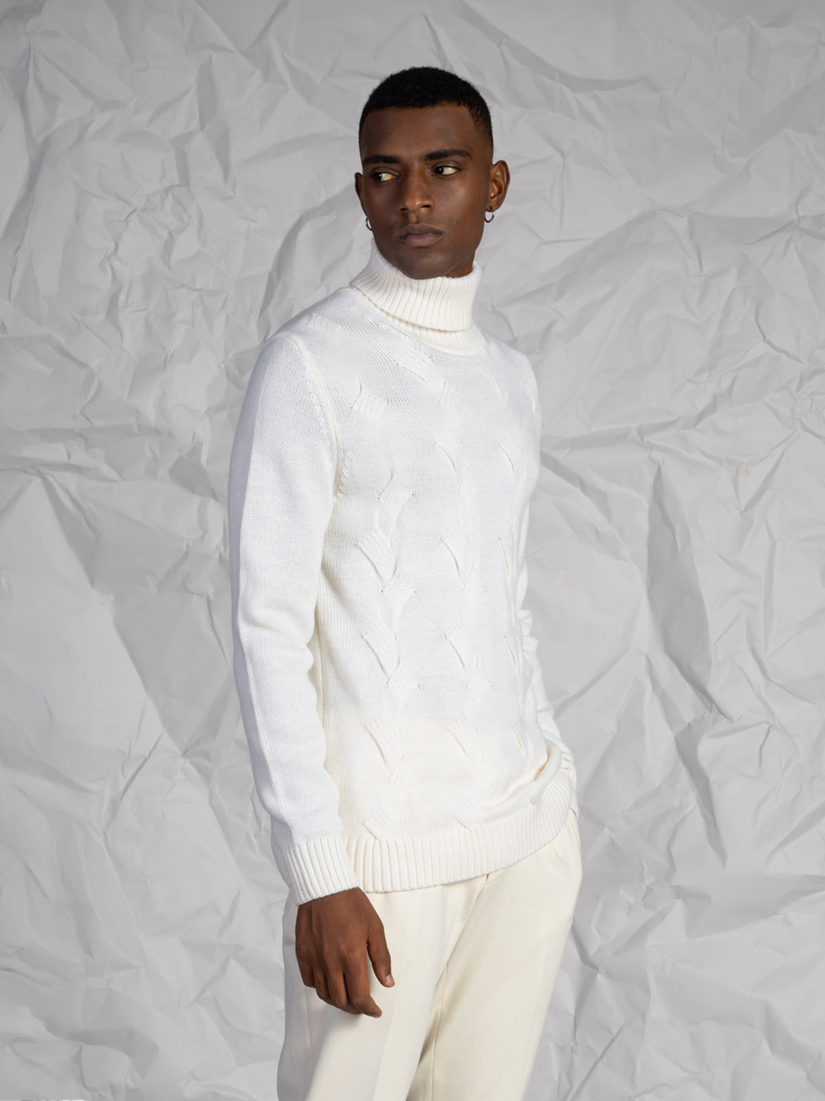 Maglia da uomo con collo alto, realizzata in misto lana calda e morbida. Il design presenta una lavorazione a maglia sul davanti e una lavorazione liscia su maniche e retro, per un effetto elegante e moderno. La tinta unita e i bordi a coste completano un capo perfetto per la stagione fredda.