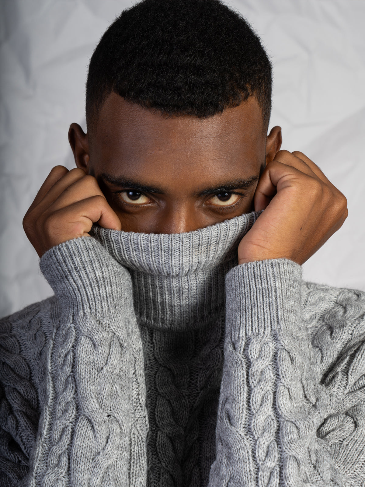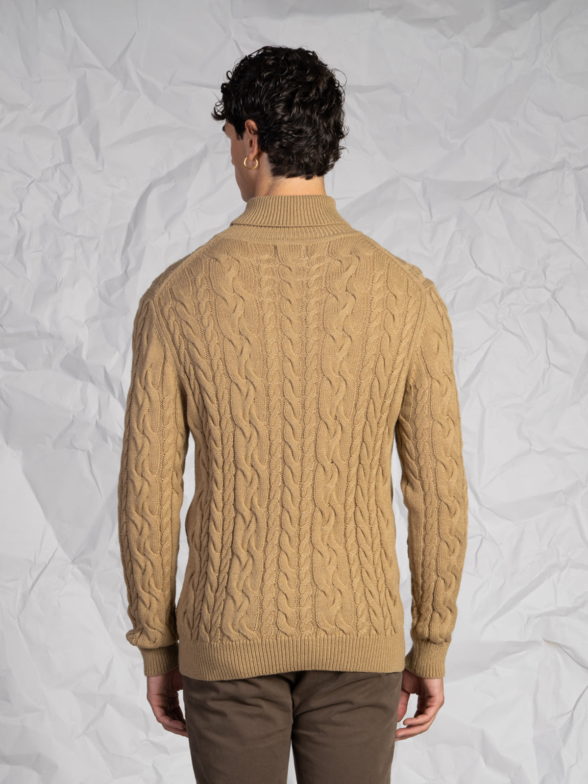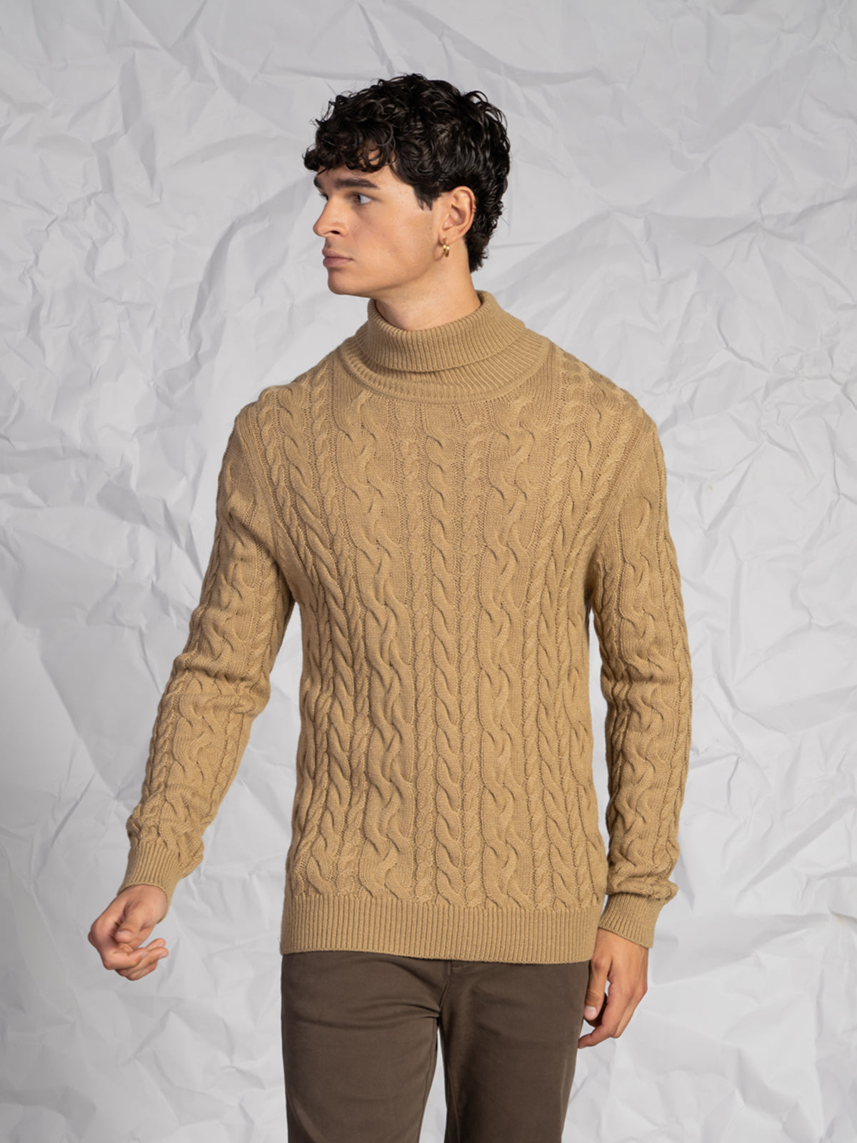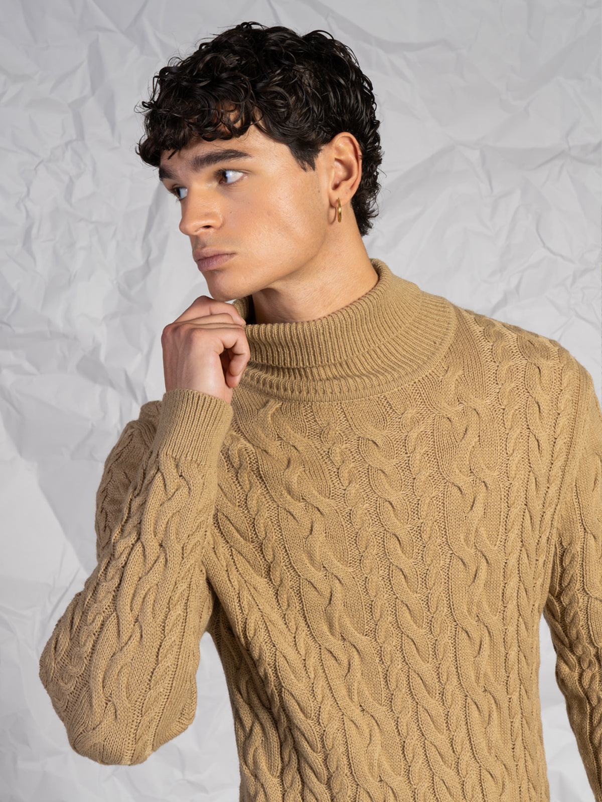 Maglia da uomo con collo alto e lavorazione a treccia, realizzata in tessuto morbido e caldo. I bordi a coste garantiscono una vestibilità confortevole e la tinta unita dona al capo uno stile classico e raffinato. Perfetta per look casual o eleganti durante la stagione fredda.