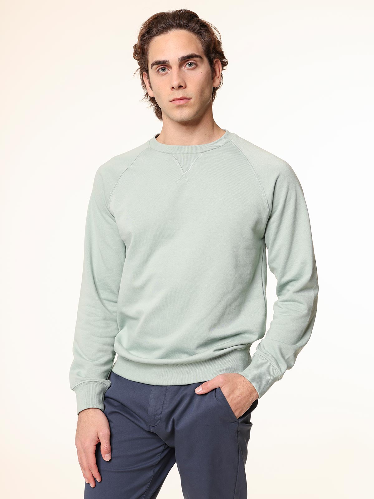 Felpa tinta unita, tessuto misto. Bordi a coste.