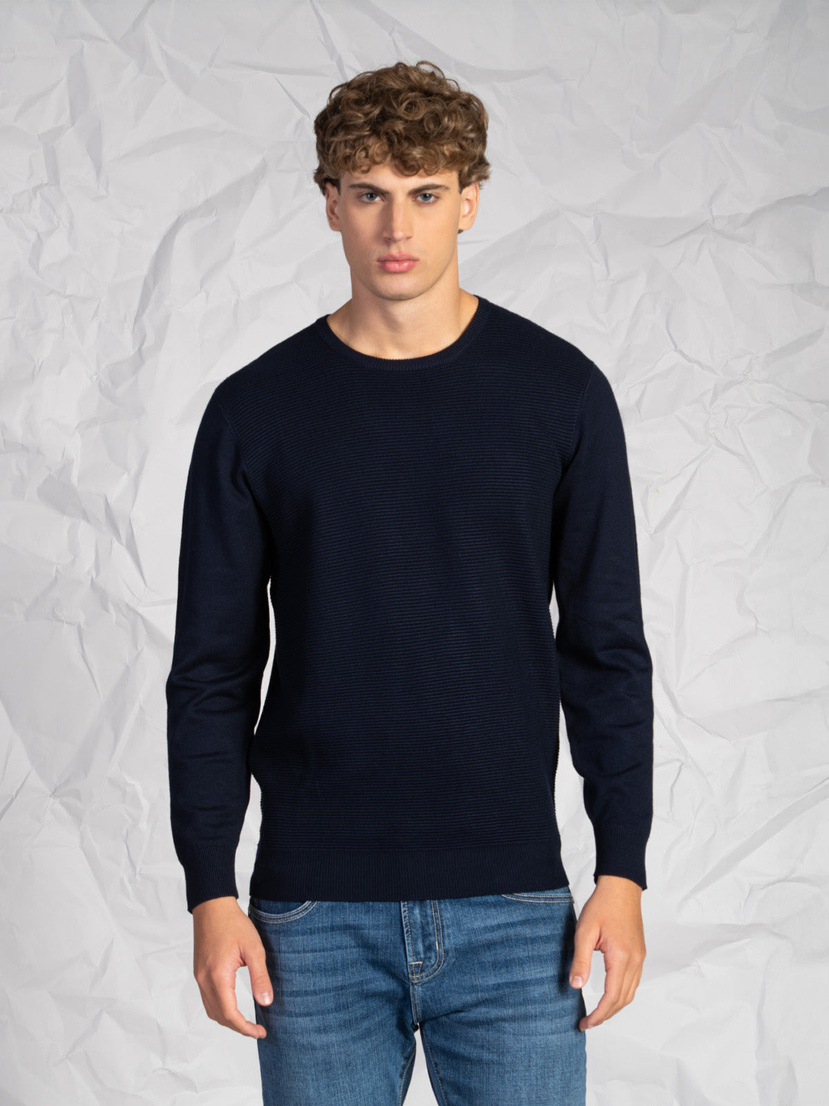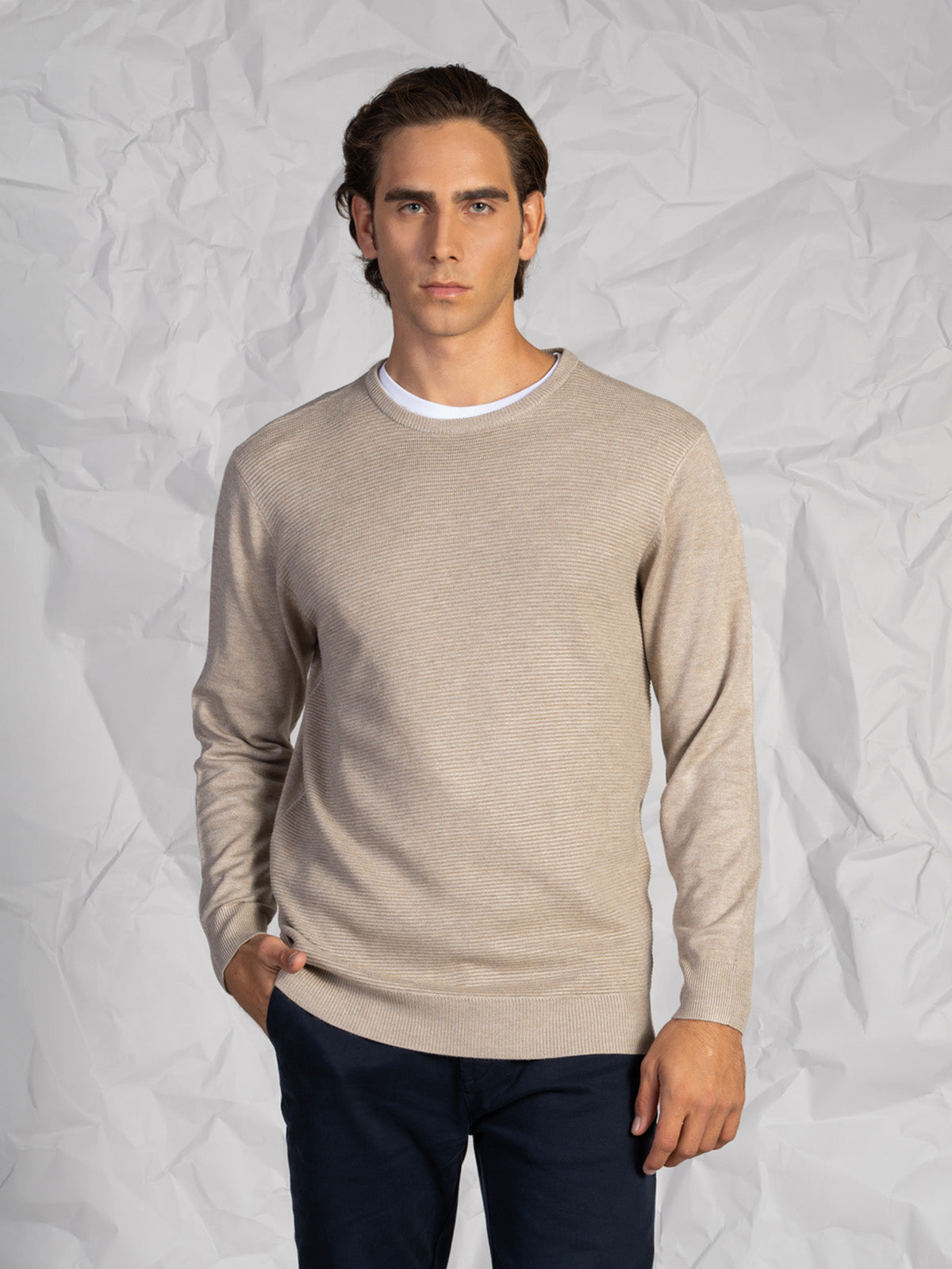 Maglia da uomo girocollo a manica lunga, realizzata in tessuto misto morbido e confortevole, ideale per la stagione più fresca. Il design combina lavorazione liscia su retro e maniche con una trama rigata sul davanti, creando un effetto moderno e raffinato.