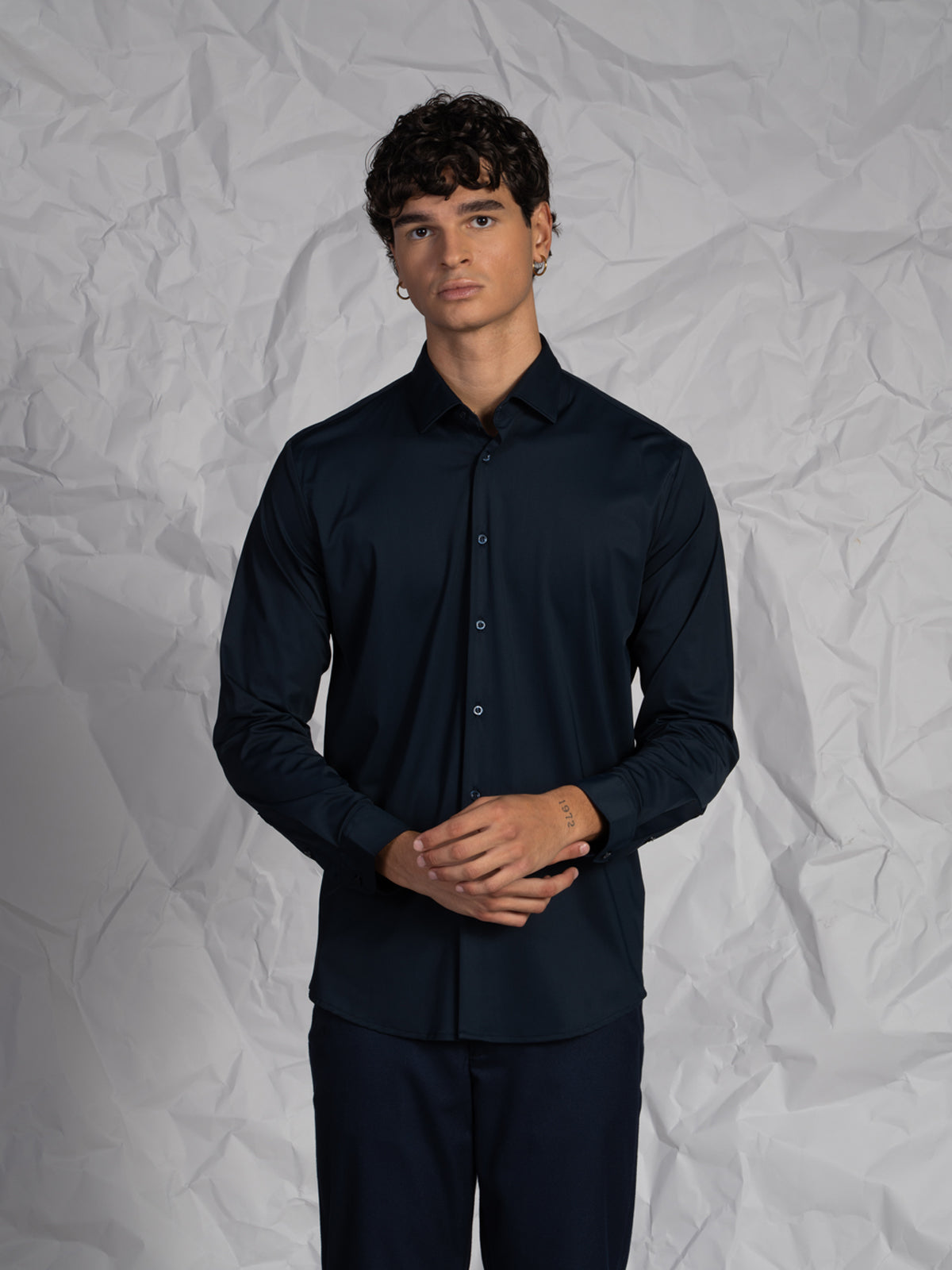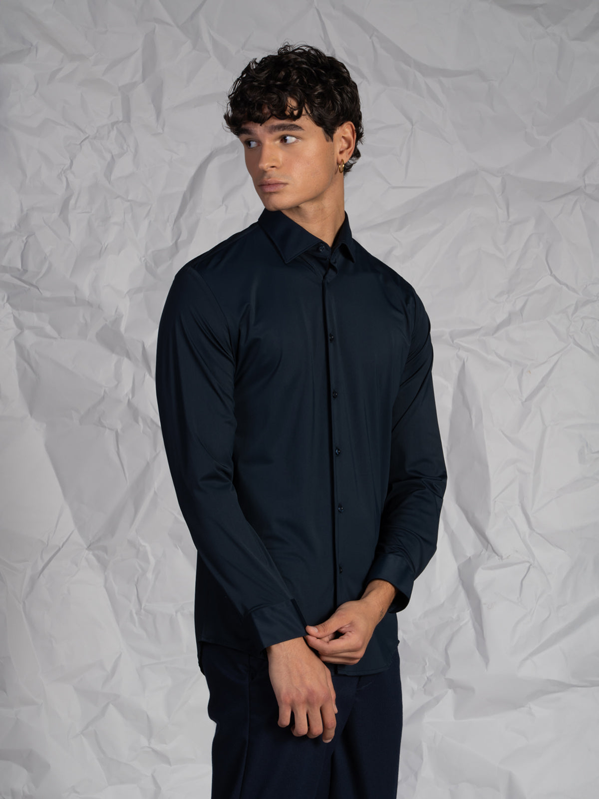 Camicia da uomo tinta unita realizzata in tessuto tecnico leggero ed elasticizzato, che garantisce comfort, traspirabilità e libertà di movimento durante tutta la giornata. Il collo classico dona un tocco elegante e versatile, mentre i polsini smussati e i rinforzi laterali assicurano una vestibilità impeccabile e una maggiore resistenza nel tempo.
